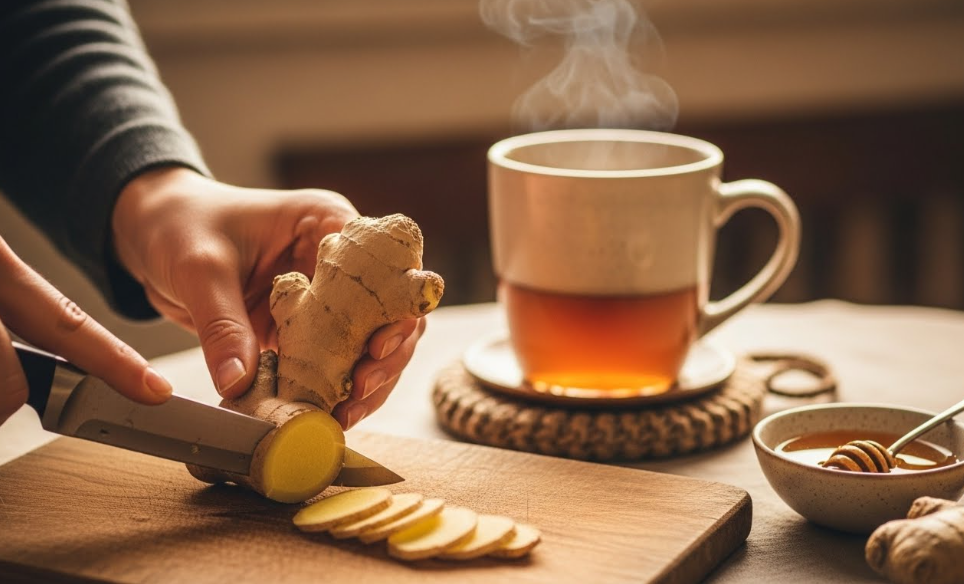 생강을 얇게 썰어 햇빛에 말린 후, 뜨거운 물 100ml에 마른 생강 10g, 꿀 적당량을 넣고 잘 우려내세요.