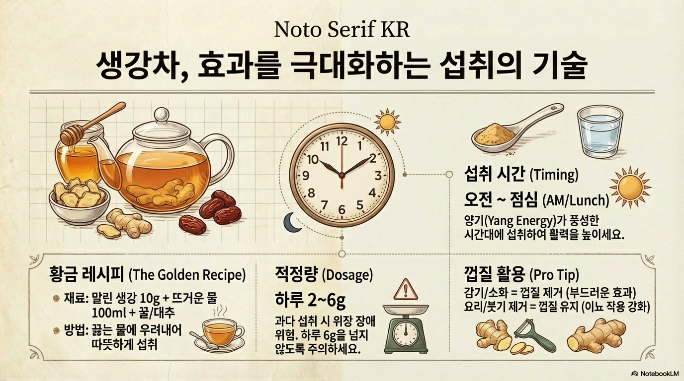 생강은 신진대사를 촉진하고 양기를 높이는 효과가 있어서 밤에 섭취하면 잠을 방해할 수 있어요. 오전과 점심에 마시는 것이 가장 좋답니다.