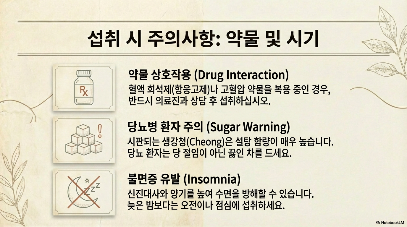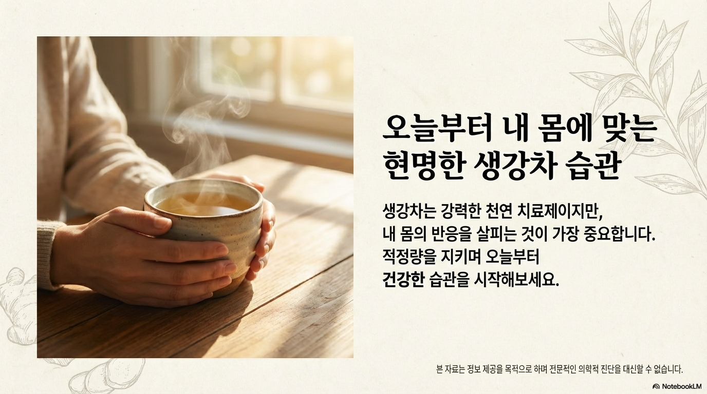 생강차는 분명 건강에 좋은 천연 치료제예요. 하지만 아무리 좋은 차도 자신의 체질에 맞게, 적정량을 지켜서 마셔야 진짜 효과를 볼 수 있답니다. 특히 만성질환이 있거나 약물을 복용 중이라면 반드시 전문가와 상담 후 드세요.