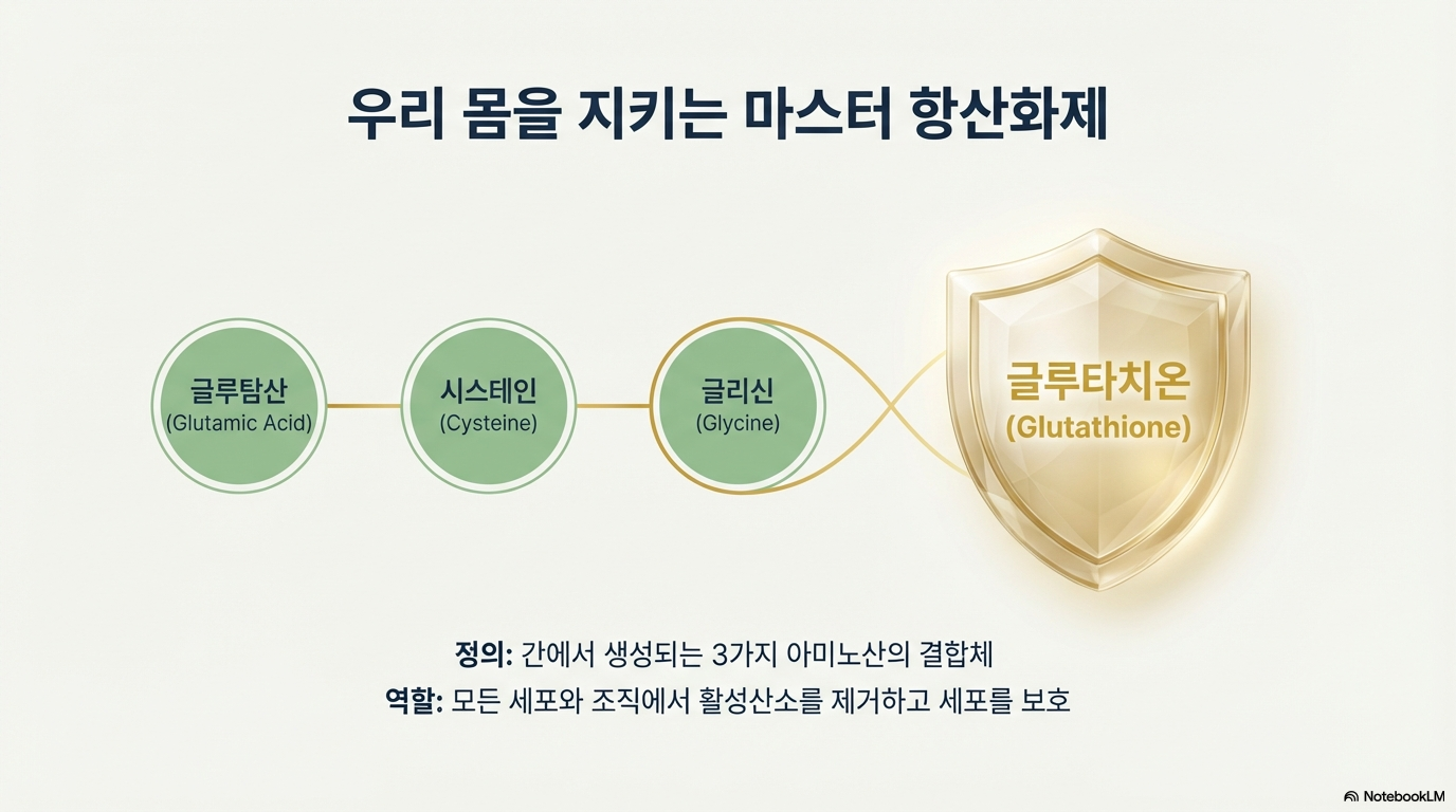 글루타치온은 글루탐산, 시스테인, 글리신 세 가지 아미노산이 결합한 물질이에요. 우리 몸, 특히 간에서 자연적으로 생성되는 강력한 항산화 물질이랍니다.