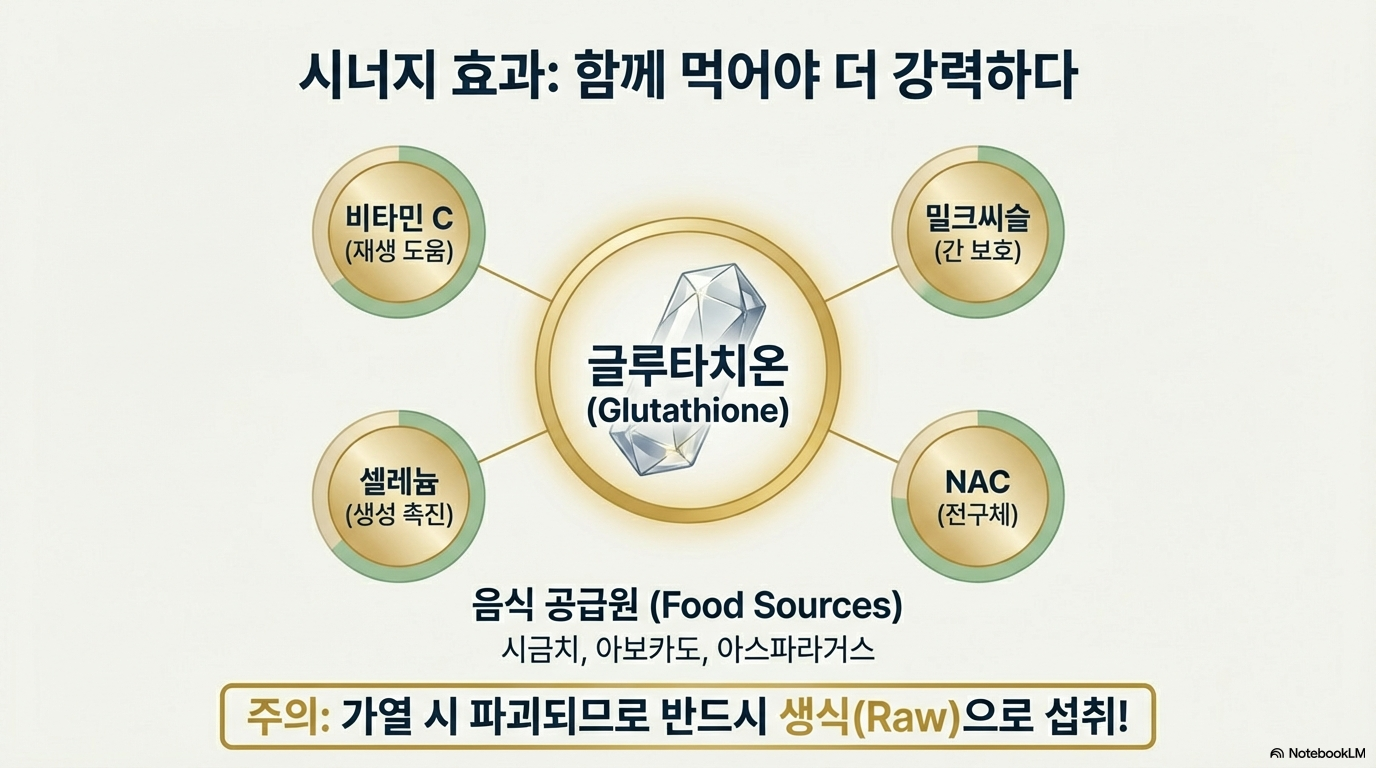 글루타치온의 효과를 높이려면 다음 성분들과 함께 섭취하는 게 도움이 돼요: