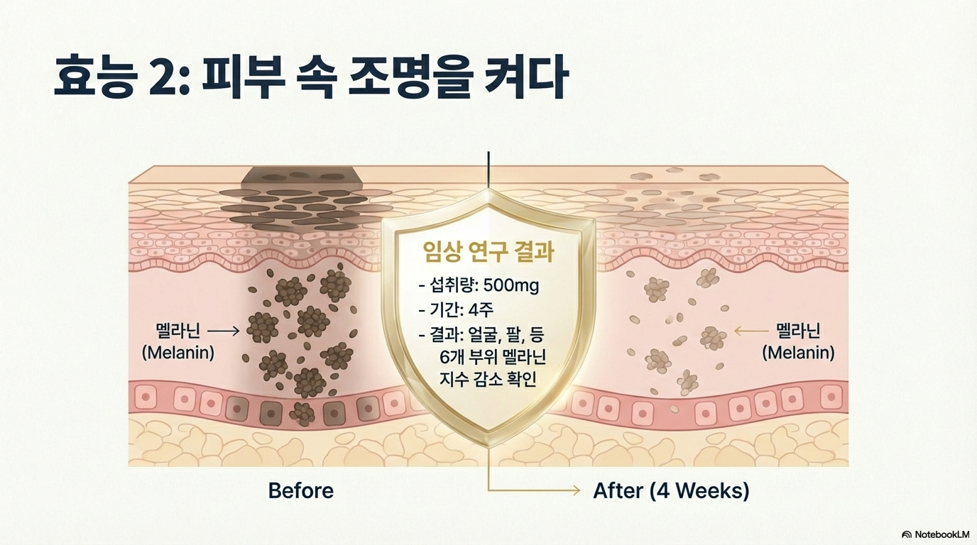 실제 연구에서 글루타치온 500mg을 4주간 섭취했을 때 얼굴, 팔, 등 6개 신체 부위에서 멜라닌 지수가 감소했다는 결과가 보고됐어요.
