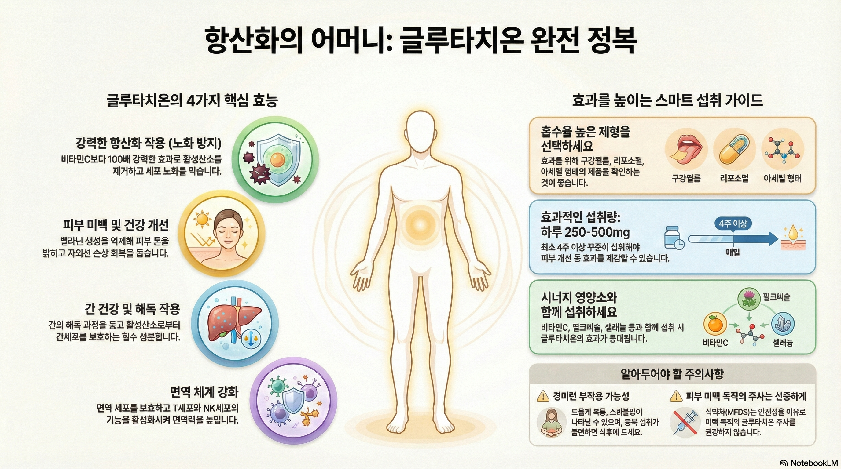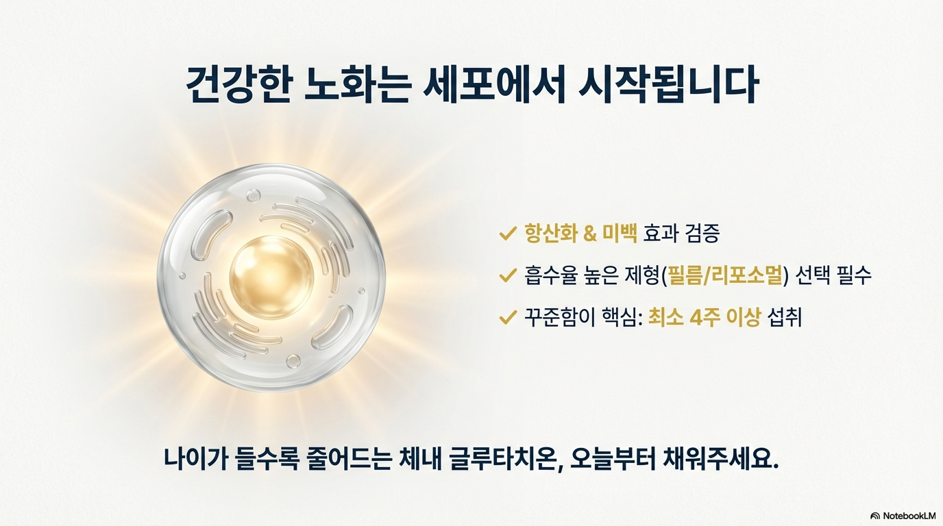 나이가 들수록 우리 몸의 글루타치온 생산량은 줄어들어요. 건강한 노화를 위해서라도 적절한 보충을 고려해보세요. 다만 건강 상태나 복용 중인 약에 따라 효과가 다를 수 있으니, 궁금한 점이 있다면 전문가와 상담하는 것을 추천해요!