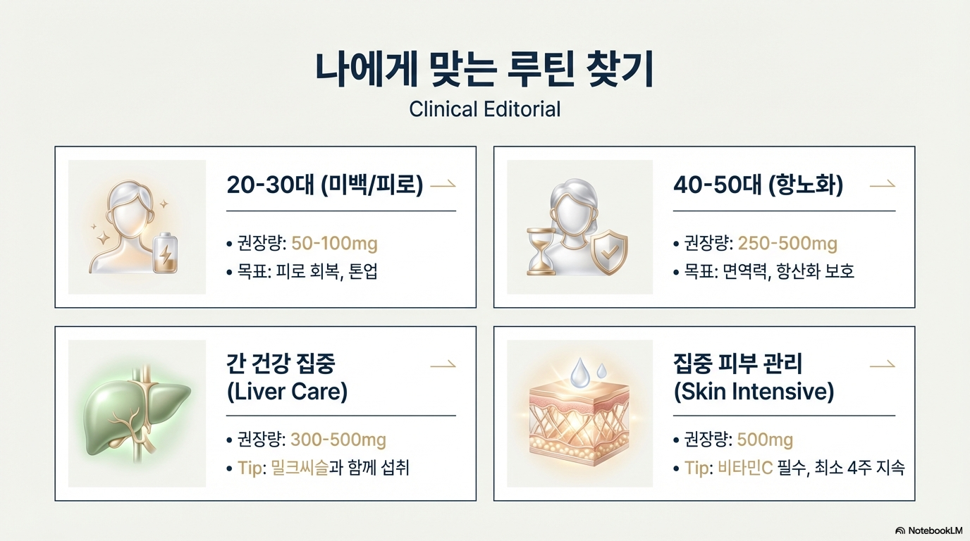 하루 50-100mg, 피부 미백과 피로 회복 목적으로 섭취