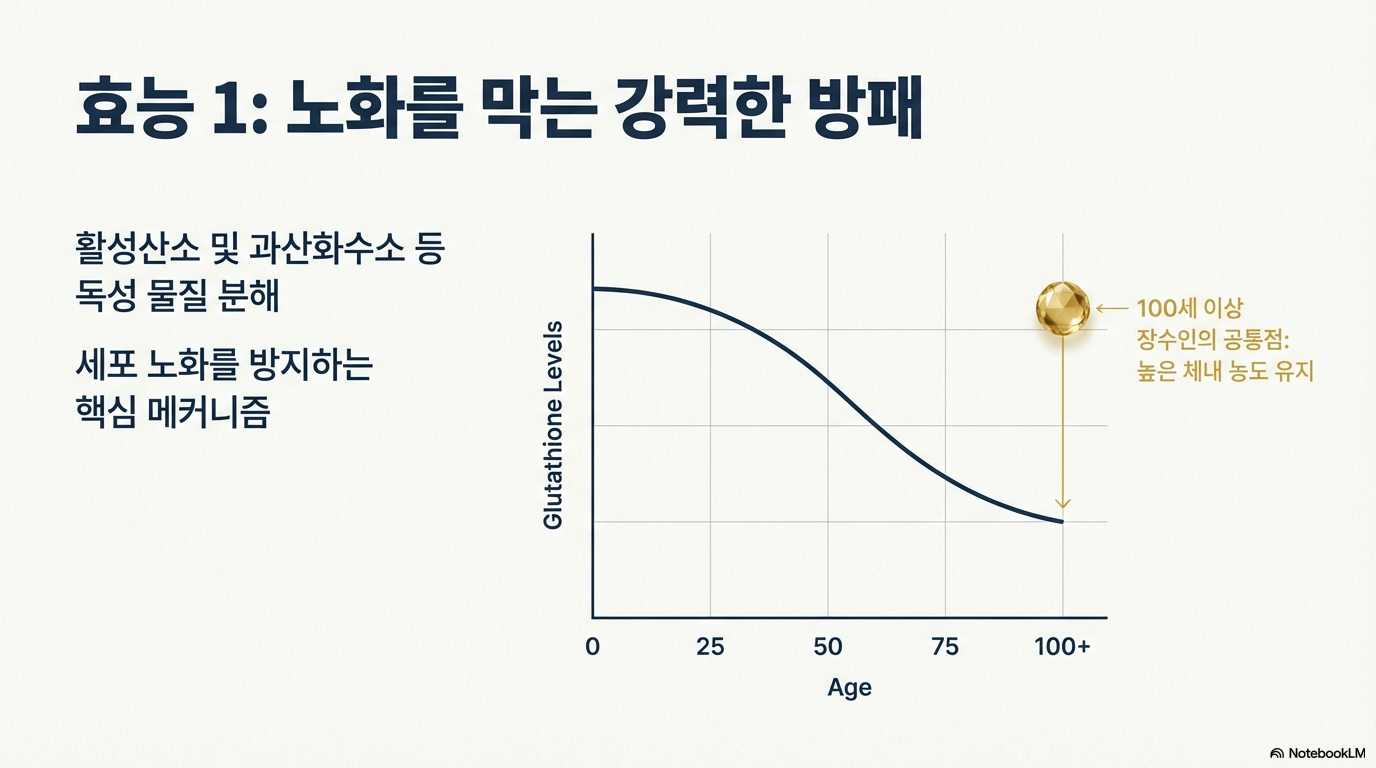 100세 이상 장수하는 사람들을 조사한 결과, 몸속 글루타치온 농도가 높다는 공통점이 발견됐답니다!