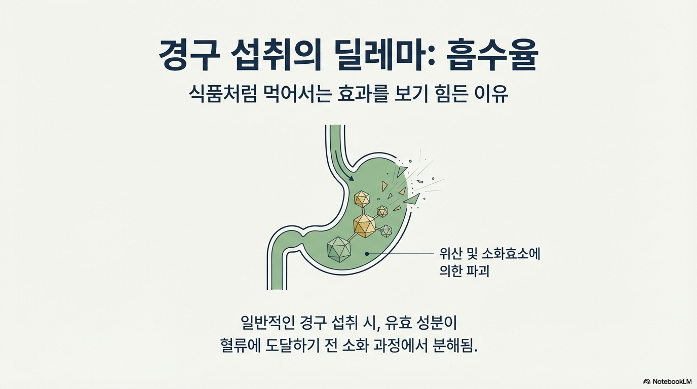 A. 예전에는 흡수율이 낮다는 문제가 있었지만, 최근 연구에서는 경구 섭취로도 유의미한 효과가 나타난다는 결과가 발표되고 있어요. 특히 리포소멀, 구강필름형 등 흡수율을 높인 제형을 선택하면 효과를 볼 수 있답니다.