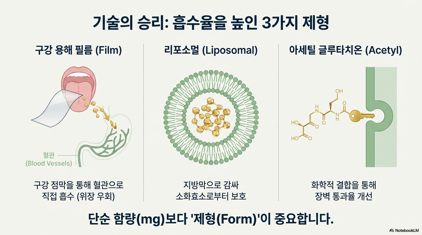 구강필름형, 리포소멀, 아세틸글루타치온 등 흡수율을 고려한 제형을 선택하세요.