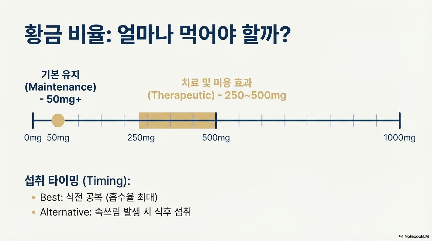 - 하루 50-500mg, 공복 섭취가 좋지만 속이 불편하면 식후 섭취