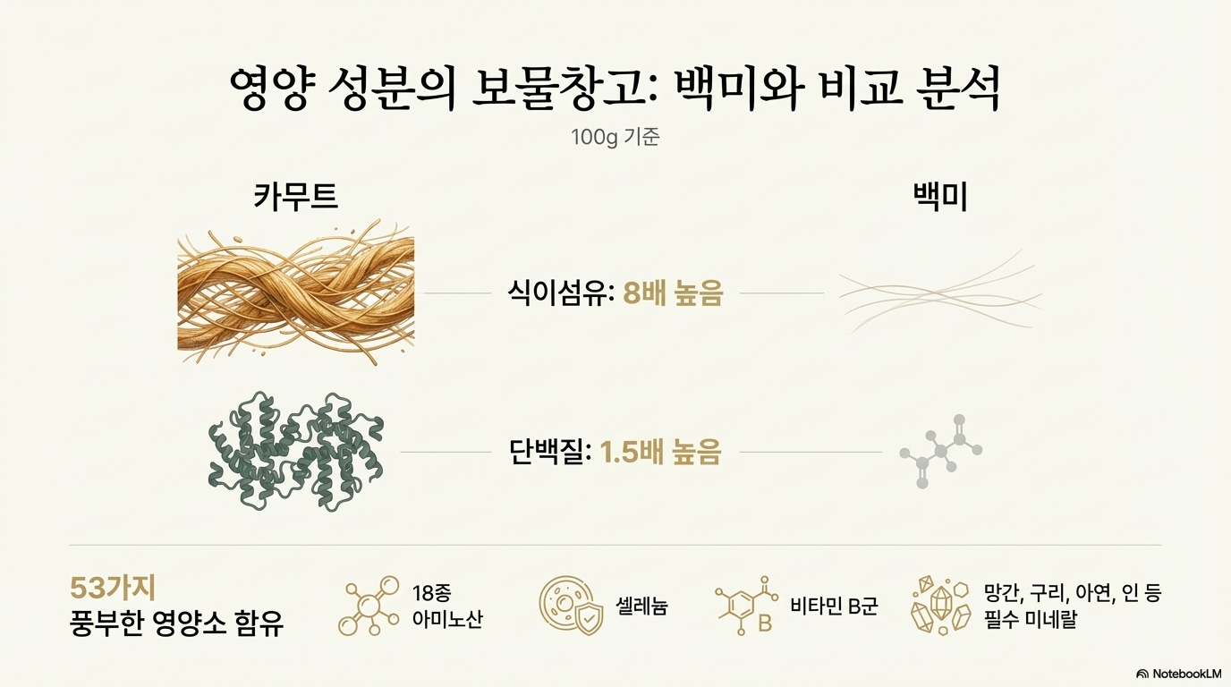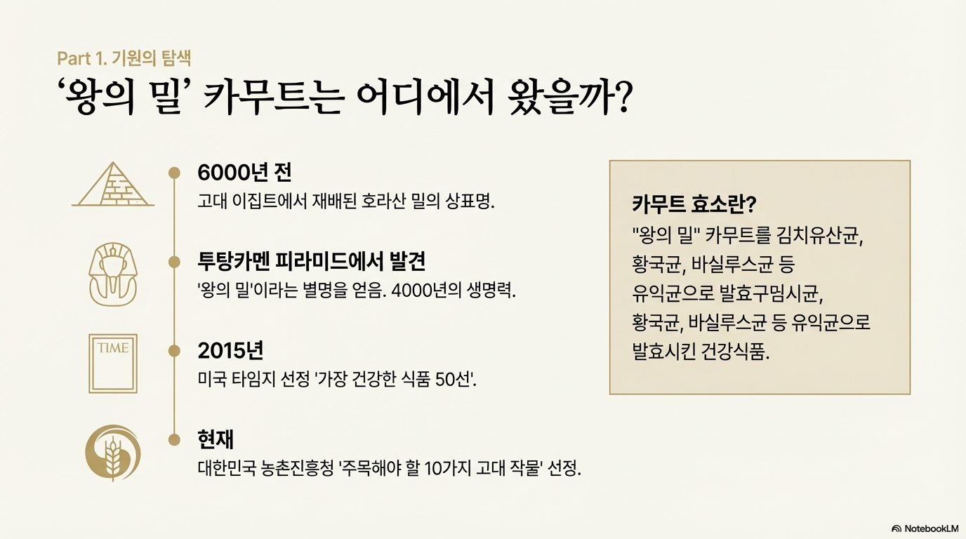 카무트는 6000년 전 고대 이집트에서 재배된 호라산 밀의 상표명이에요. 투탕카멘 피라미드에서 발견되어 '왕의 밀'로 알려졌죠. 무려 4000여 년간 생존한 강인한 생명력으로 유명해요.