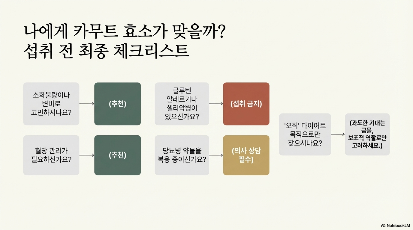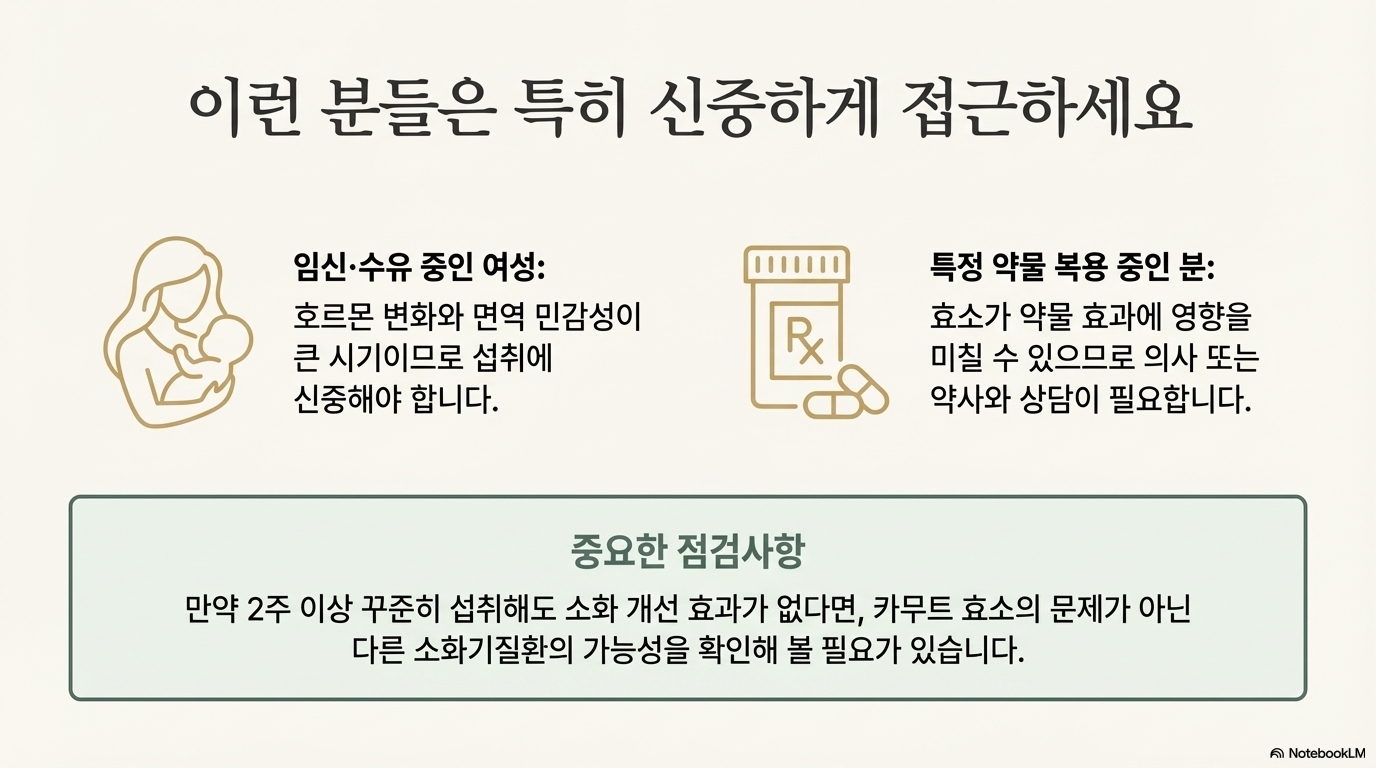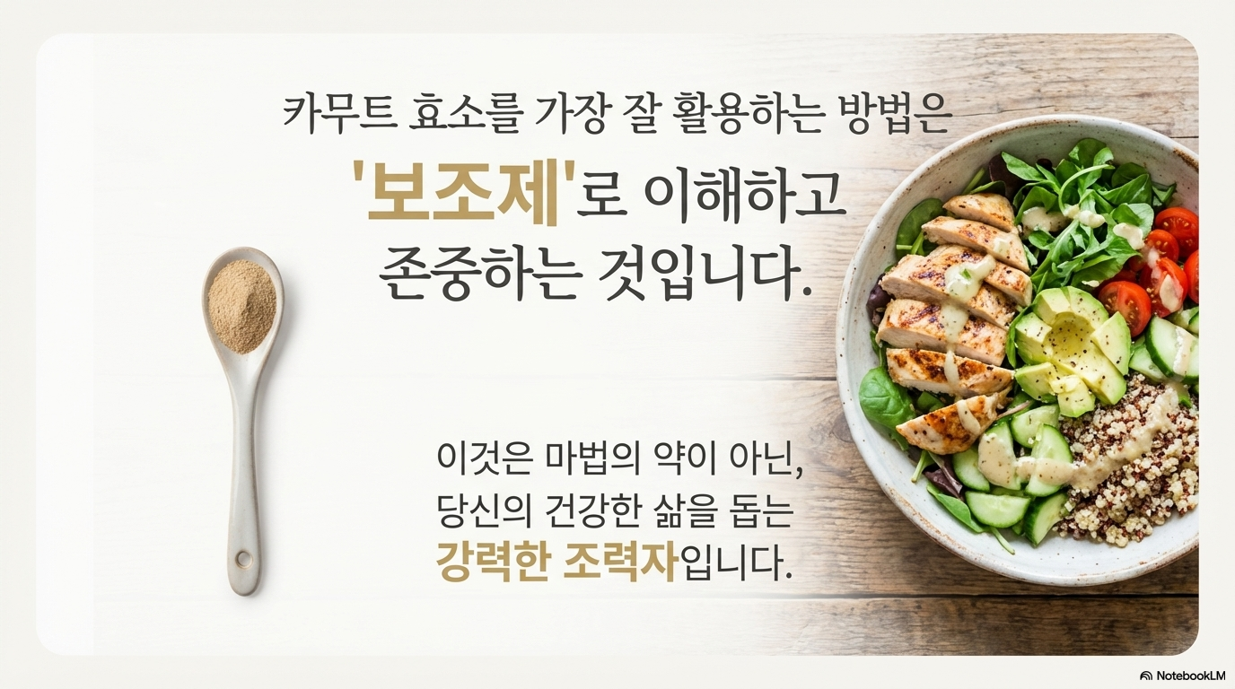 중요한 건 카무트 효소를 '보조제'로 인식하는 거예요. 균형잡힌 식단과 규칙적인 운동과 함께할 때 진정한 효과를 볼 수 있답니다. 체질에 맞는 적정량을 꾸준히 섭취하되, 부작용이 나타나면 즉시 중단하고 전문가와 상담하세요.