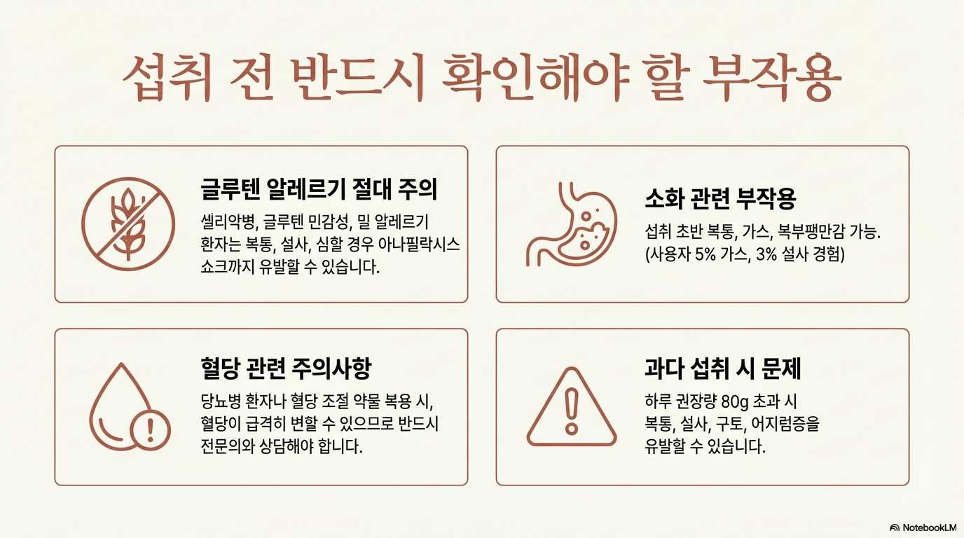 카무트는 일반 밀보다 글루텐 함량이 낮지만, 글루텐이 완전히 없는 것은 아니에요. 셀리악병이나 글루텐 민감성이 있는 분은 복통, 설사, 영양 흡수 장애가 생길 수 있어요. 밀 알레르기가 있다면 피부 두드러기, 입안 가려움, 호흡곤란, 심한 경우 아나필락시스 쇼크까지 발생할 수 있으니 반드시 주의하세요.