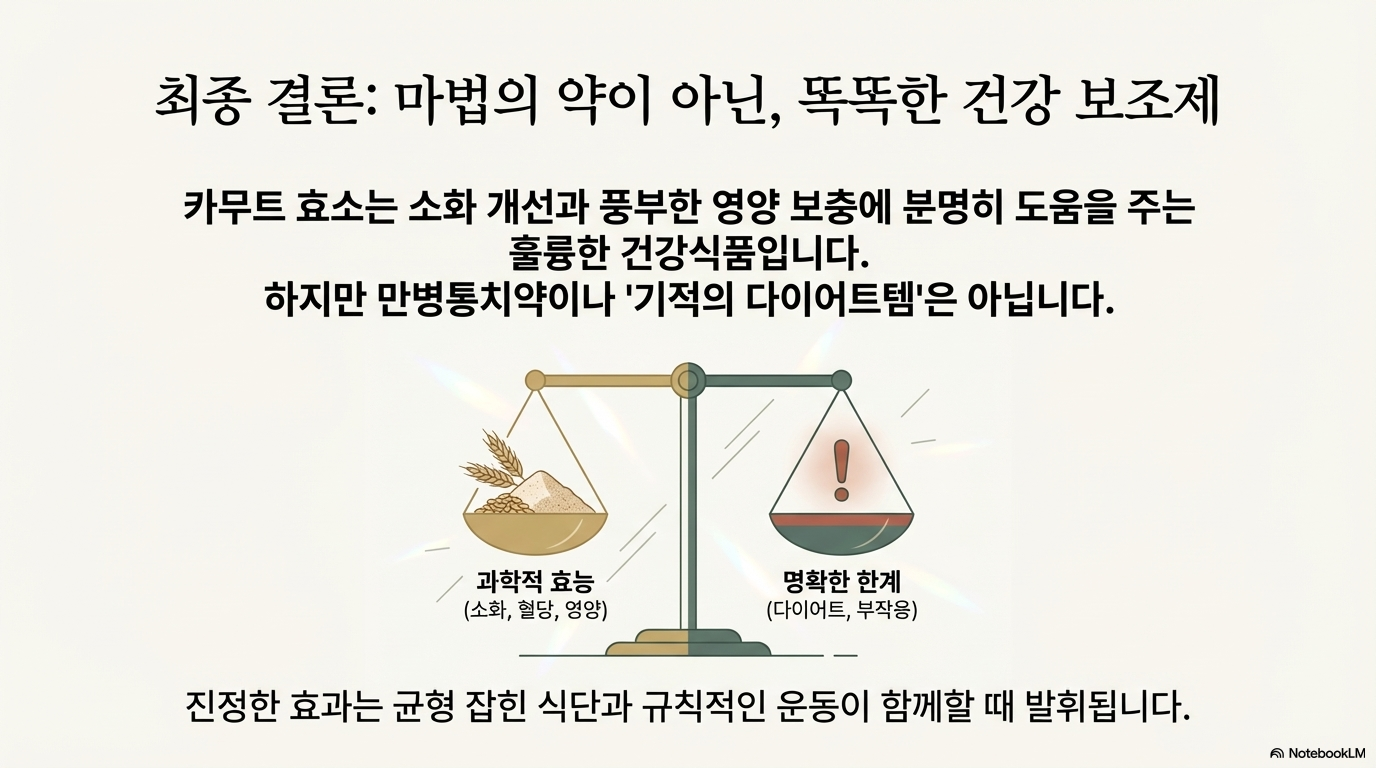 카무트 효소는 소화 개선과 영양 보충에 도움이 되는 건강식품이에요. 하지만 '만능 다이어트템'은 아니랍니다. 자연건강 애호가들은 장 건강 개선과 대사 촉진을 강조하지만, 과학적으로는 체지방 분해 효과가 명확히 입증되지 않았어요.