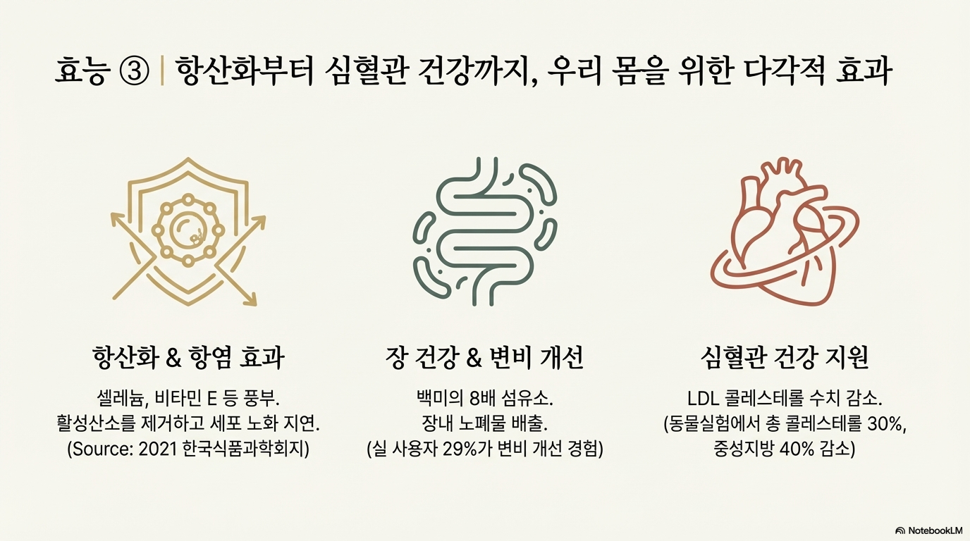 백미의 8배에 달하는 섬유소가 장내 노폐물 배출을 도와요. 사용자 29%가 변비 개선 효과를 경험했다고 해요. 바실루스균은 위산과 열에 강해 장에 도달할 때까지 살아있어 장 건강 개선에 효과적이에요.