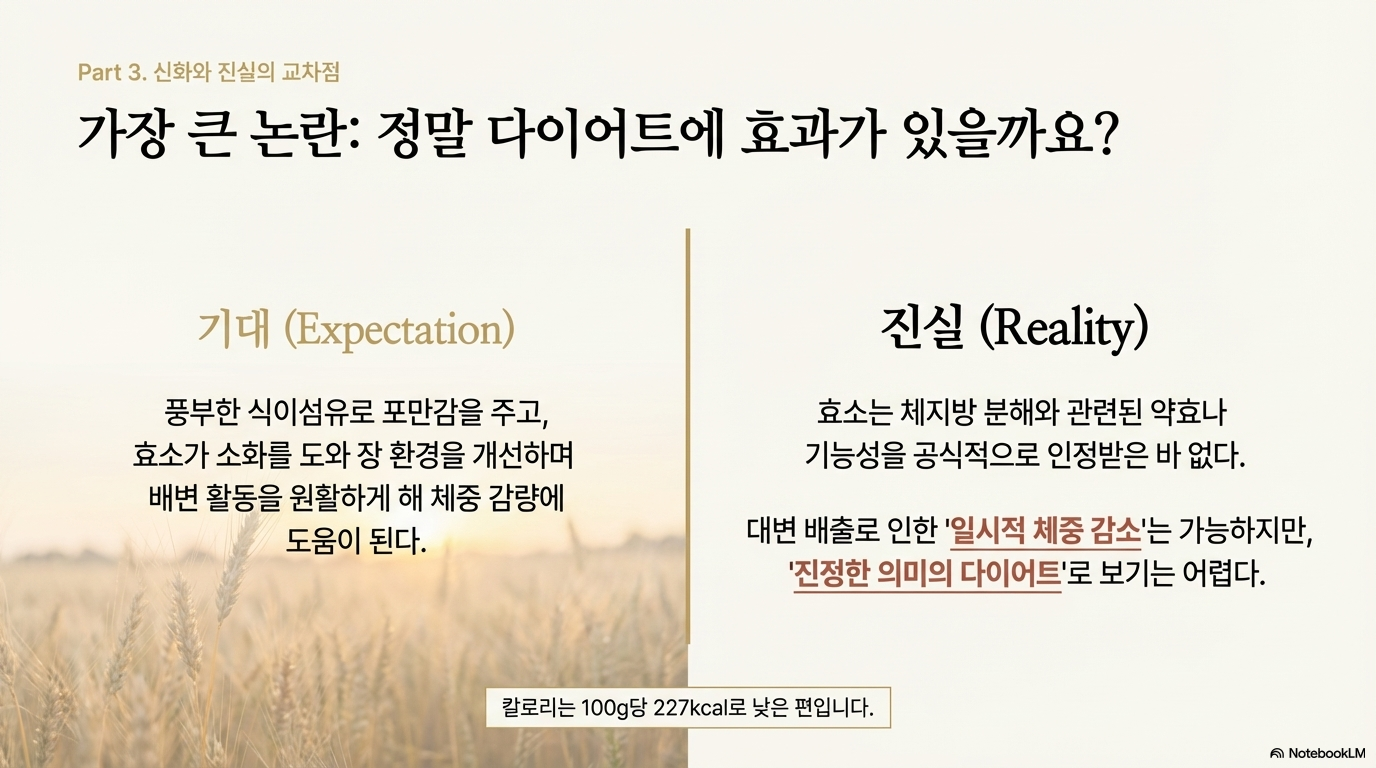 칼로리가 낮고(100g당 227kcal) 식이섬유가 풍부해 포만감이 오래 유지돼요. 하지만 여기서 중요한 점이 있어요.