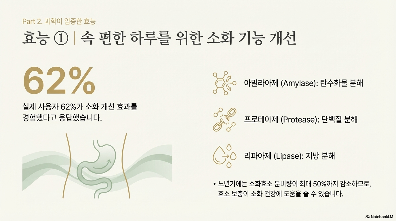 아밀라아제, 리파아제, 프로테아제 등 소화효소가 풍부해요. 실제 사용자 리뷰를 보면 62%가 소화 개선 효과를 경험했다고 해요.