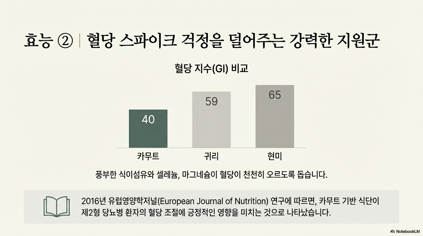 2016년 유럽영양학저널 연구에서 카무트 기반 식단이 제2형 당뇨병 환자의 혈당 조절에 도움이 된다는 결과가 발표됐어요. 탄수화물이 현미와 비슷하지만 마그네슘까지 함유되어 당뇨 개선에 유리하답니다.