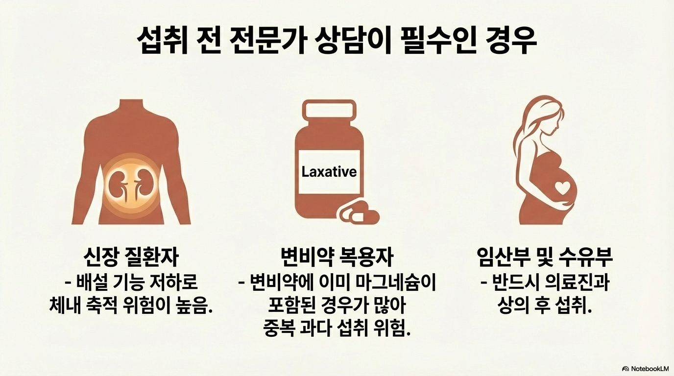 임신 중이거나 수유 중인 분들은 마그네슘 보충제를 먹기 전에 반드시 의료 전문가와 상담하셔야 해요.