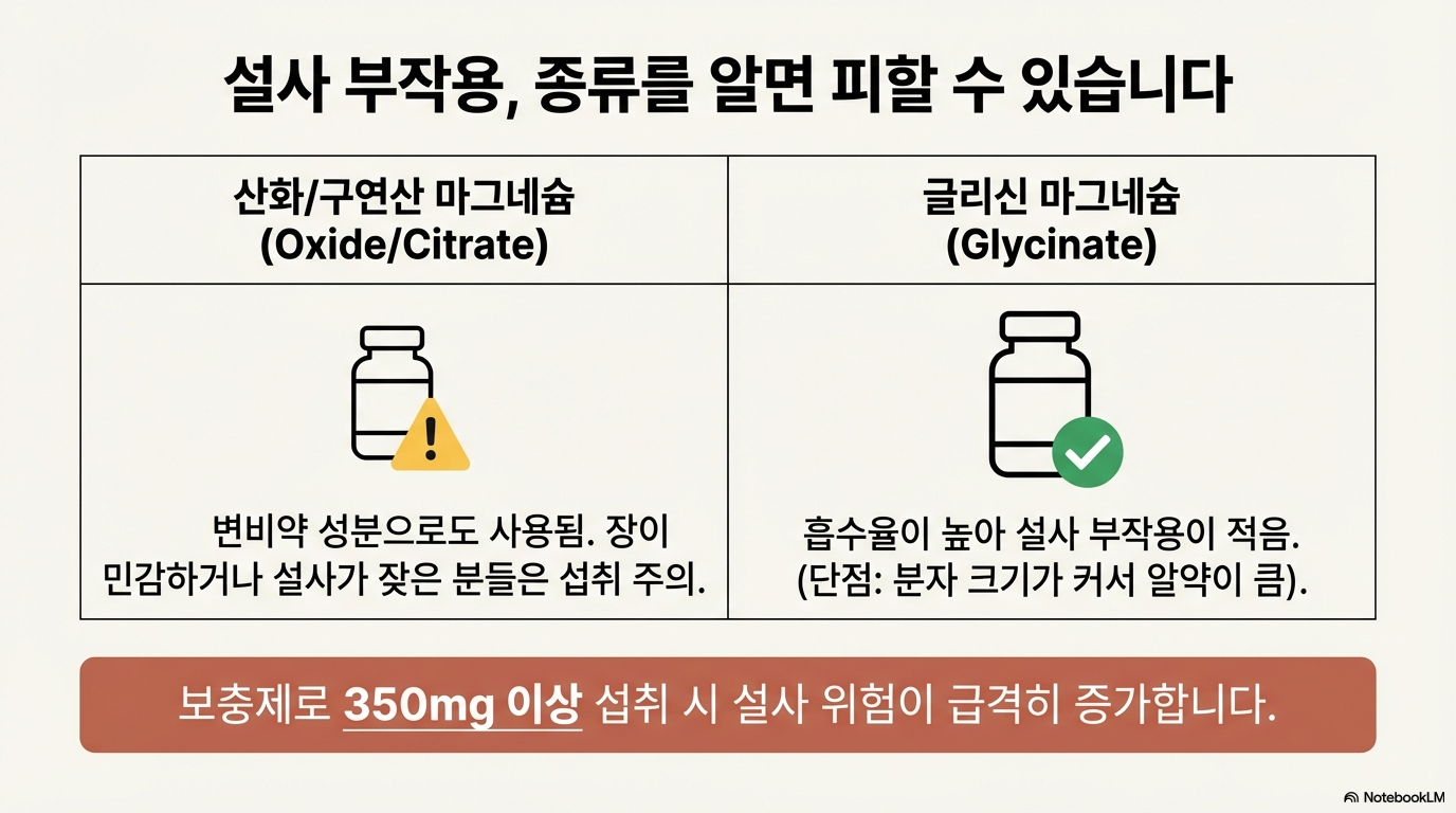 산화마그네슘과 구연산 마그네슘은 변비약 성분으로도 쓰이기 때문에 장이 민감한 분들은 특히 주의가 필요해요. 평소 배가 자주 아프거나 설사를 자주 하는 분이라면 피하는 게 좋아요. 반면 글리신 마그네슘(마그네슘 글리시네이트)은 흡수율이 높아서 설사 부작용이 적은 편이에요. 다만 분자 크기가 커서 고용량 제품을 만들기 어렵다는 단점이 있답니다.