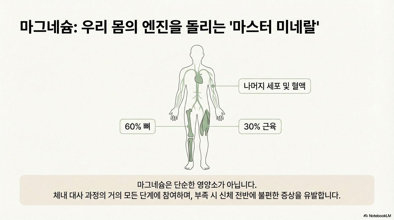 마그네슘은 우리 몸에서 정말 중요한 역할을 하는 필수 미네랄이에요. 체내에 있는 마그네슘의 약 60%는 뼈에, 30%는 근육에, 나머지는 세포와 혈액에 분포해 있답니다.