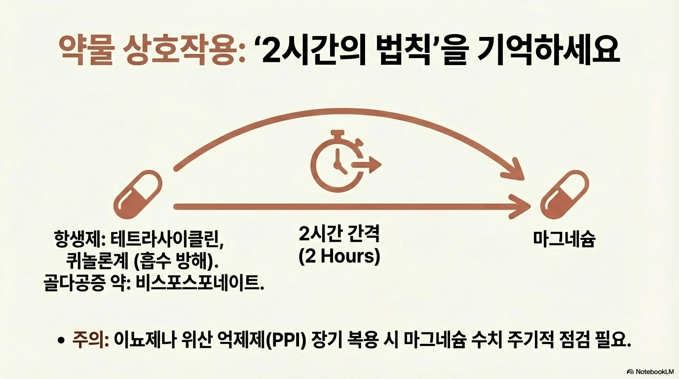 항생제(테트라사이클린, 퀴놀론계)나 골다공증약(비스포스포네이트)을 복용 중이라면 마그네슘과 최소 2시간 간격을 두고 먹어야 해요. 이뇨제나 위산 억제제(PPI)를 장기 복용하는 경우에도 마그네슘 수치를 주기적으로 체크하는 게 좋답니다.