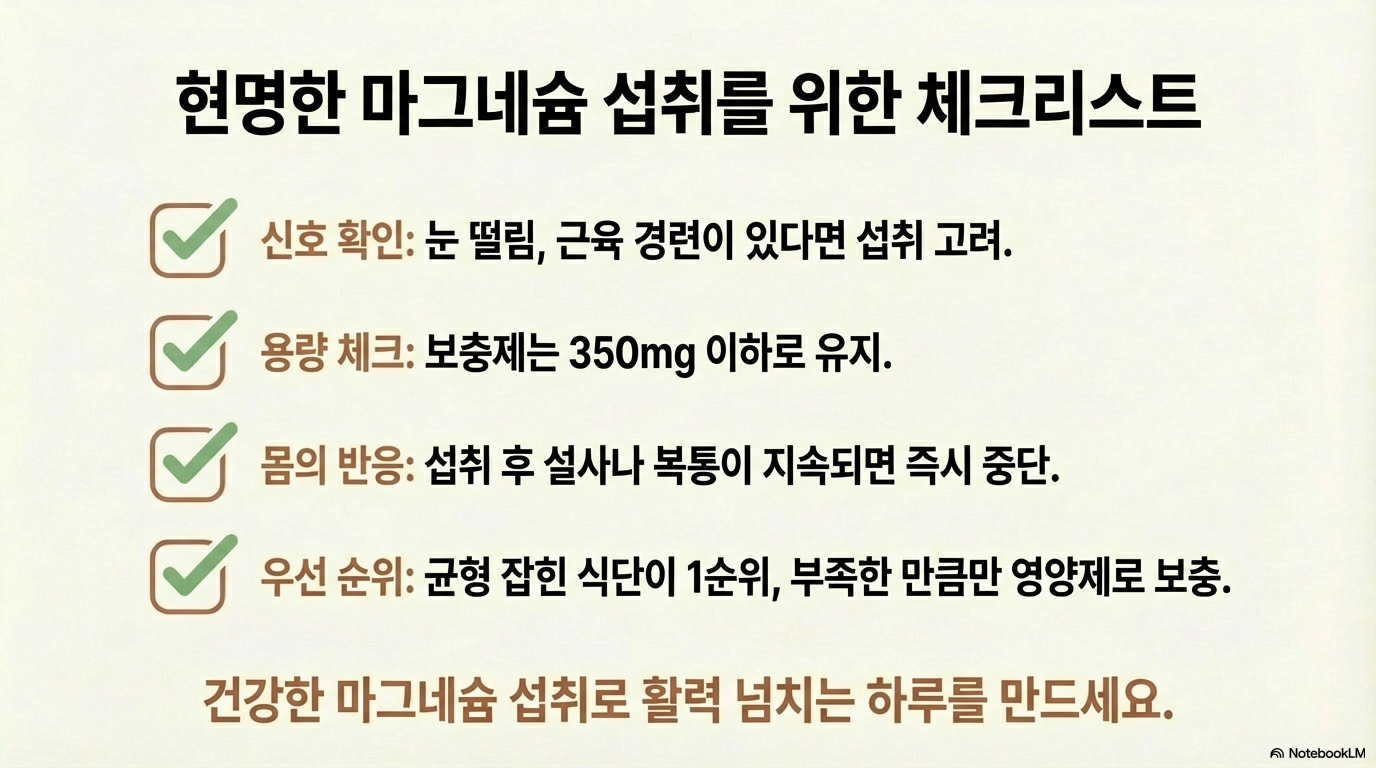 마그네슘은 분명 우리 몸에 꼭 필요한 영양소예요. 하지만 무조건 많이 먹는다고 좋은 게 아니라 자신의 상태에 맞게 적절히 섭취하는 게 가장 중요하답니다. 평소 균형 잡힌 식단으로 마그네슘을 충분히 섭취하고, 부족한 부분만 영양제로 보충하는 게 가장 현명한 방법이에요.