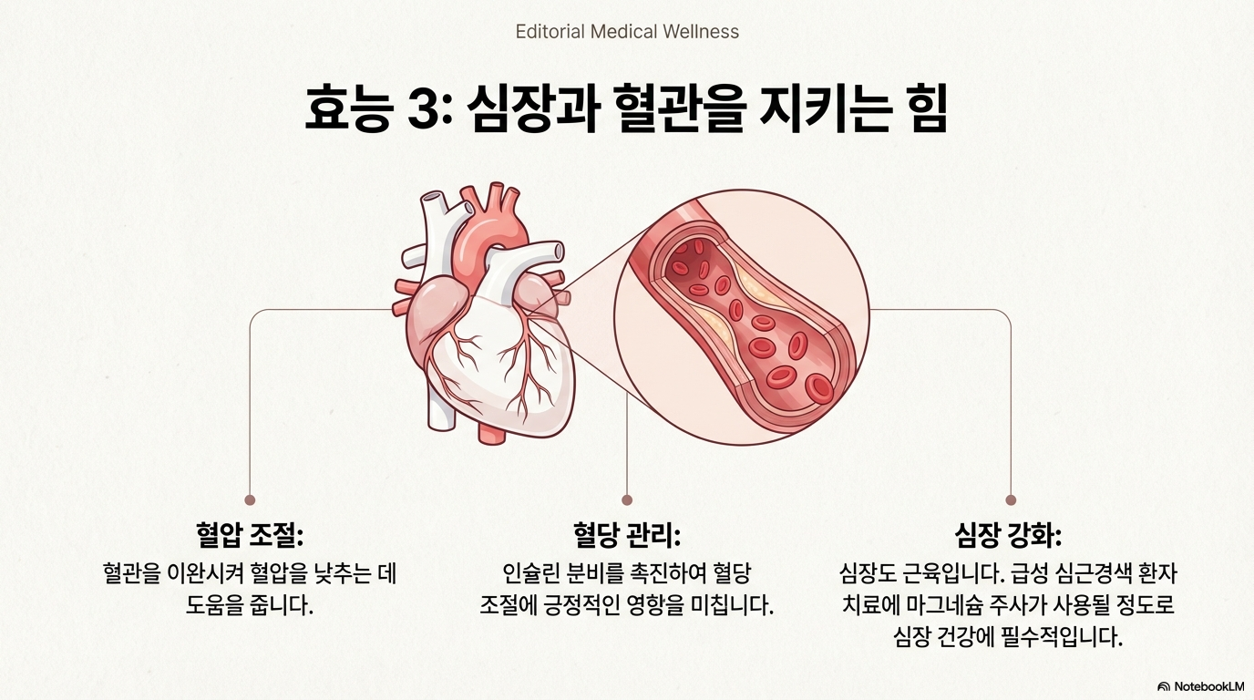 마그네슘은 혈관을 이완시켜 혈압을 낮추는 데 도움을 줘요. 또한 인슐린 분비를 촉진해서 혈당 관리에도 긍정적인 영향을 미친답니다.