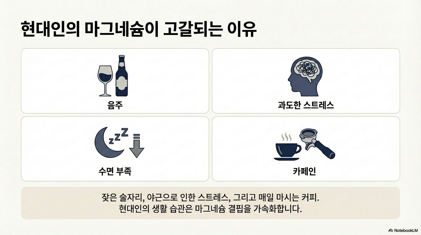 특히 잦은 음주, 과도한 스트레스, 수면 부족 같은 상황이 겹치면 마그네슘 결핍 증상이 더 심해질 수 있어요. 카페인을 많이 섭취하는 분들도 주의가 필요해요.