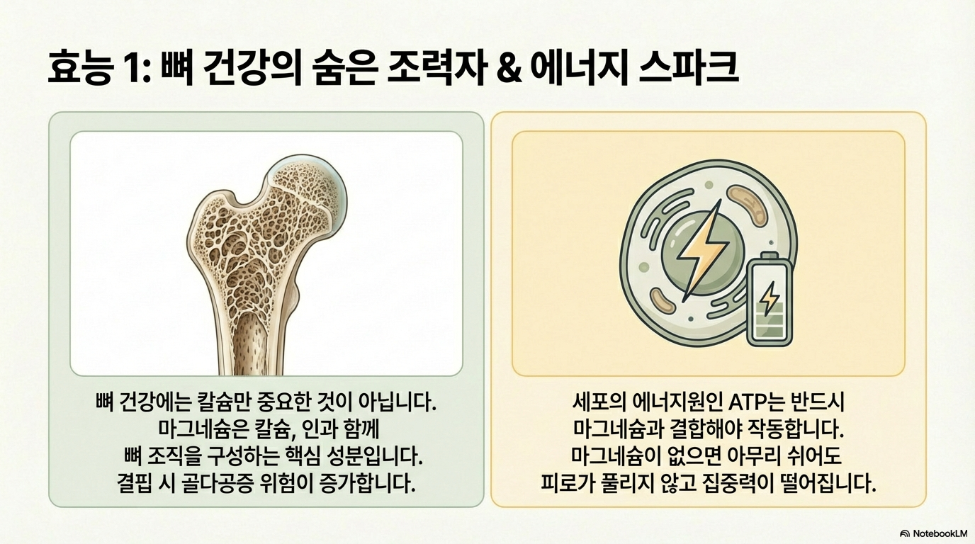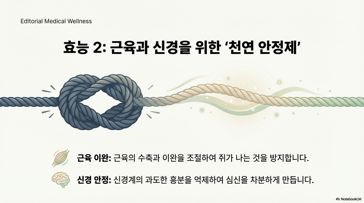 마그네슘은 근육의 수축과 이완을 조절하고 신경계의 과도한 흥분을 억제하는 역할을 해요. 그래서 '천연 안정제'라고도 불리죠.