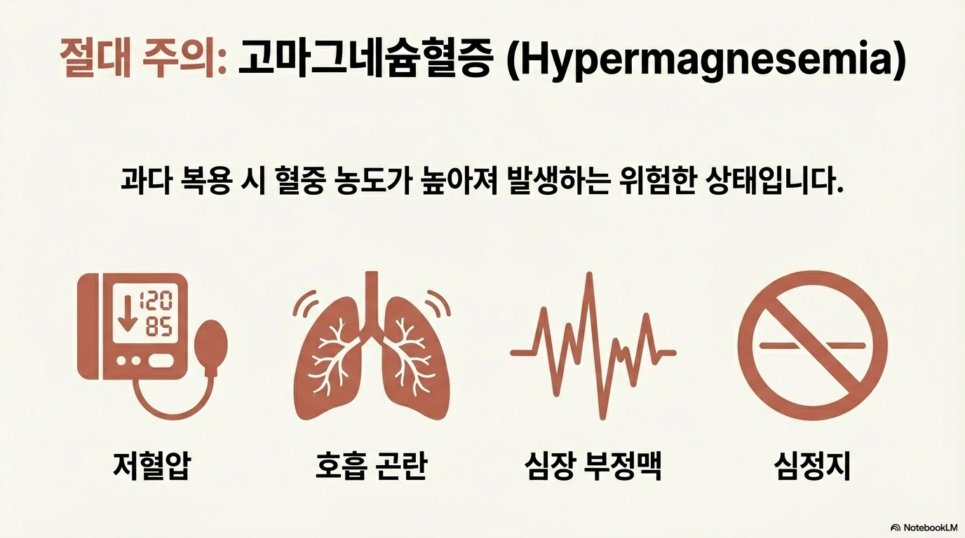 과다 복용하면 혈중 마그네슘 농도가 높아져서 고마그네슘혈증이 발생할 수 있어요. 심한 경우 호흡곤란, 저혈압, 심장 부정맥, 심지어 심정지까지 올 수 있으니 주의해야 해요.