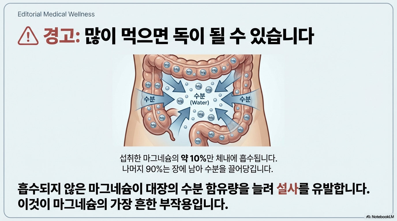마그네슘의 가장 대표적인 부작용은 바로 설사예요. 섭취한 마그네슘 중 약 10%만 흡수되고 나머지는 장에 남아서 변의 수분량을 증가시켜요. 특히 보충제로 350mg 이상 섭취하면 설사가 발생할 수 있어요. 흡수되지 않은 마그네슘이 대장의 수분 함유량을 늘려서 나타나는 현상이죠.