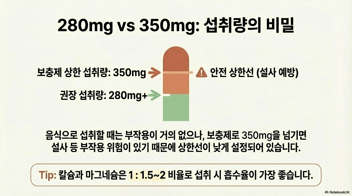 종합비타민, 칼슘제, 비타민B 제제 등에도 마그네슘이 포함된 경우가 많아요. 여러 영양제를 함께 먹는다면 전체 마그네슘 함량을 꼭 확인하세요.