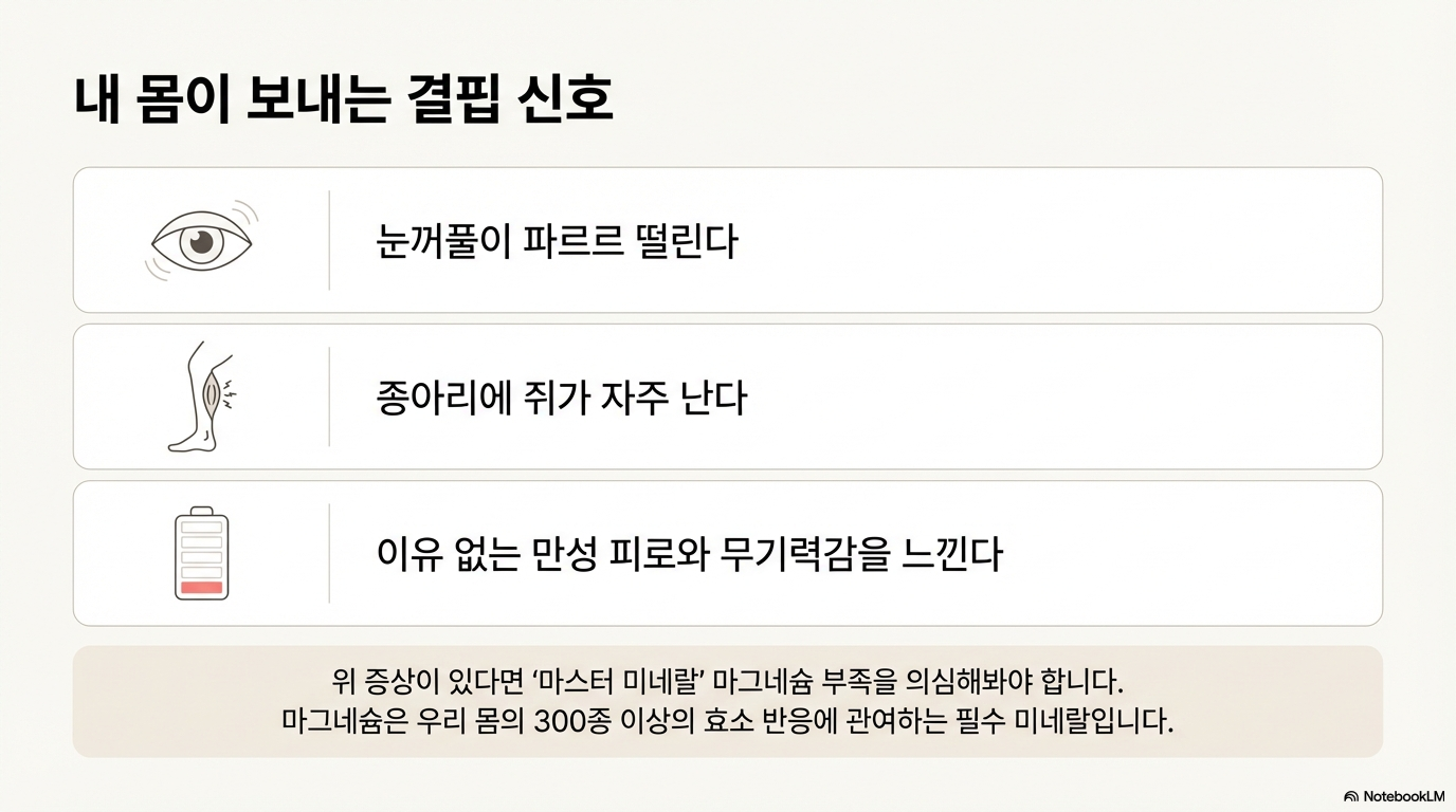 눈꺼풀이 파르르 떨리거나 종아리에 쥐가 자주 나는 분들이라면 마그네슘 결핍을 의심해볼 수 있어요. 또한 만성 피로나 무기력감을 자주 느끼는 경우에도 마그네슘이 도움이 될 수 있답니다.