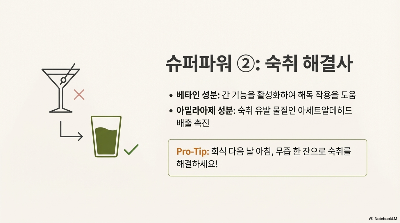 술 먹고 다음날 죽는 줄 알았는데 무즙 한 잔 마시면 금방 나아요. 무의 베타인 성분이 간 기능을 도와주고, 아밀라아제가 아세트알데히드(숙취 유발 물질)를 배출시켜주거든요.