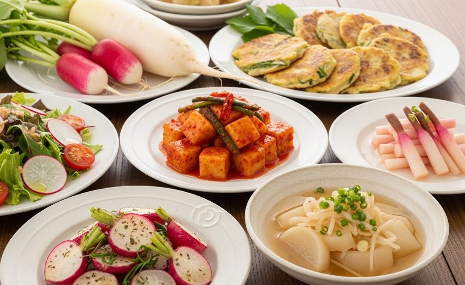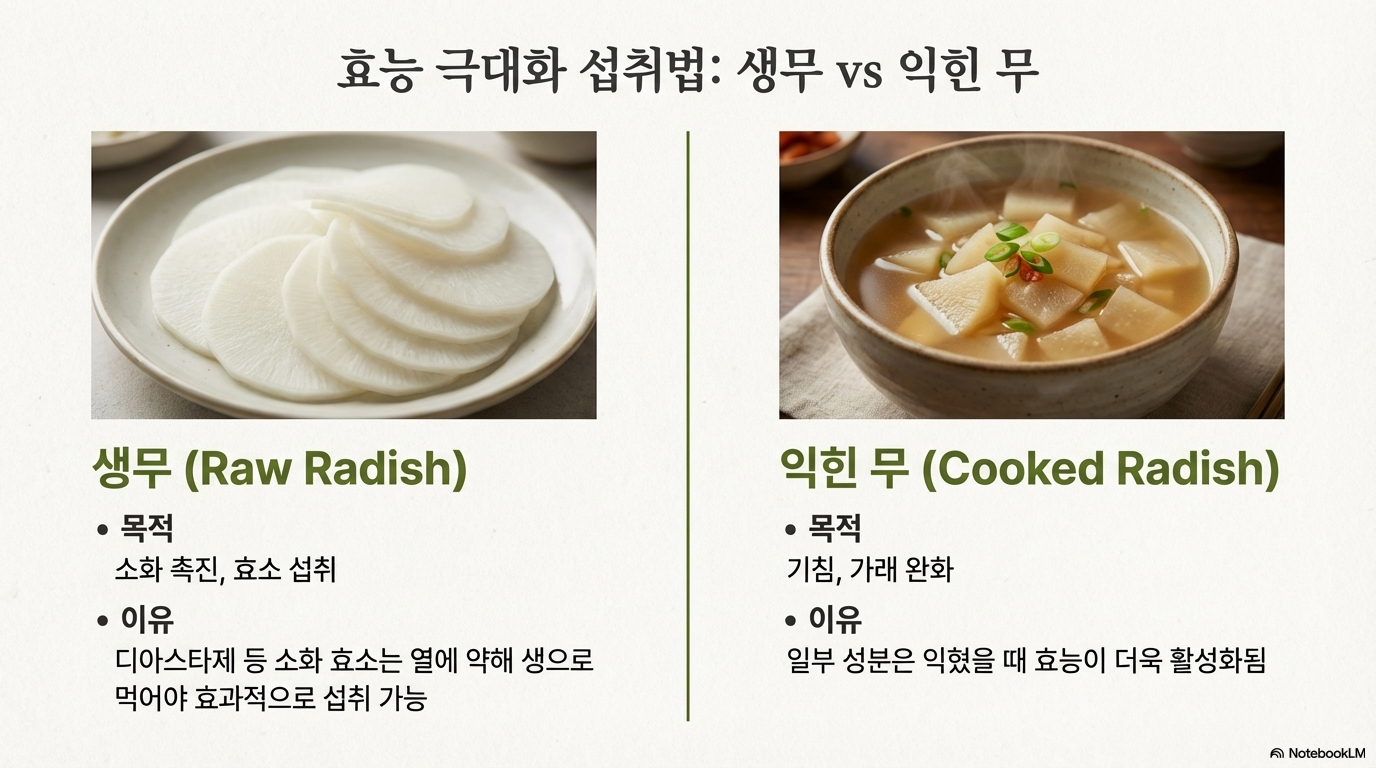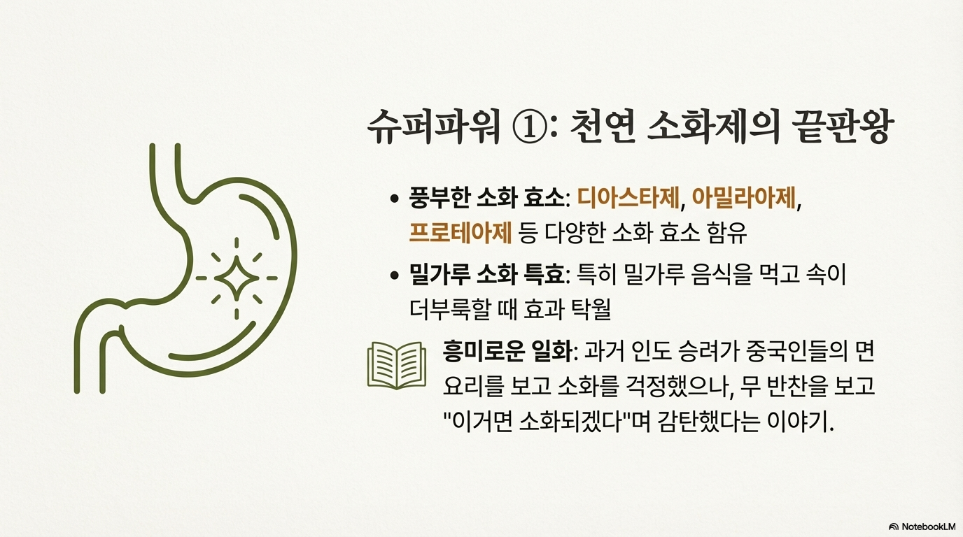 무가 천연 소화제라고 불리는 이유가 있어요. 무에는 디아스타제, 아밀라아제, 프로테아제 같은 소화 효소가 가득 들어있거든요. 특히 밀가루 음식 먹고 속 더부룩할 때 생무 먹으면 완전 시원해져요.