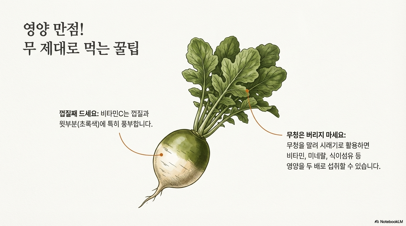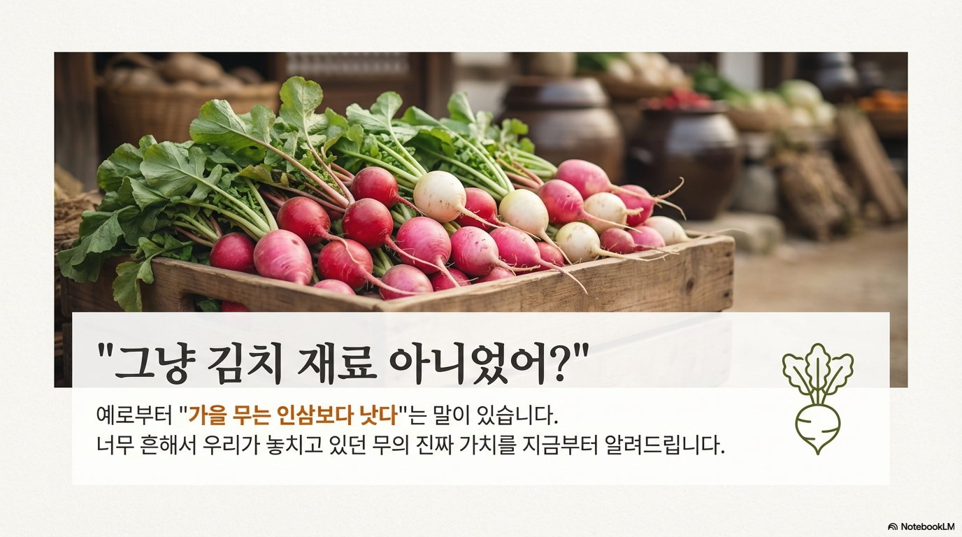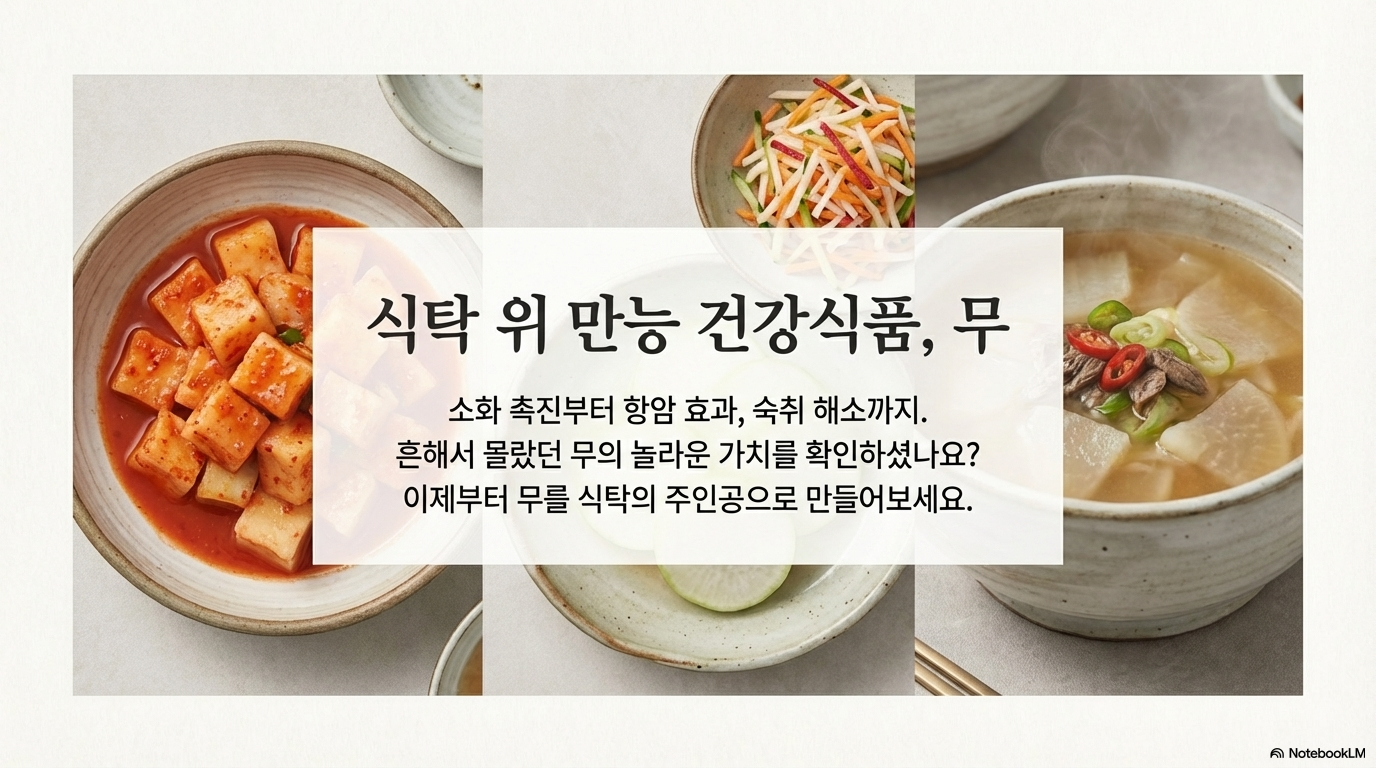 무는 정말 너무 흔해서 그 가치를 모르고 지나치기 쉬운 채소예요. 하지만 소화 촉진부터 암 예방, 숙취 해소까지 못하는 게 없는 만능 건강 식품이에요.