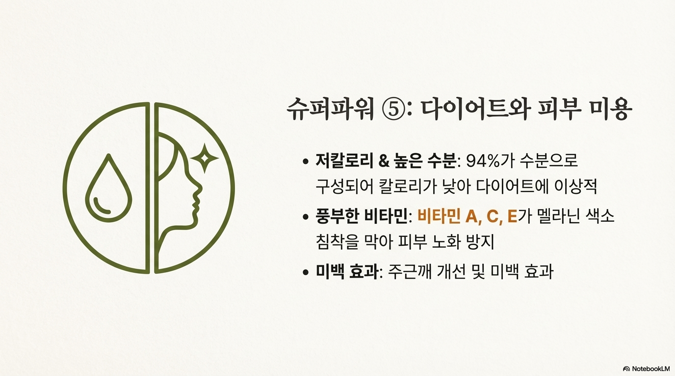 무는 94%가 수분이고 칼로리도 낮아서 다이어트 식품으로 완벽해요. 게다가 비타민A, C, E가 풍부해서 멜라닌 색소 침착을 막아주고 피부 노화도 예방해줘요.