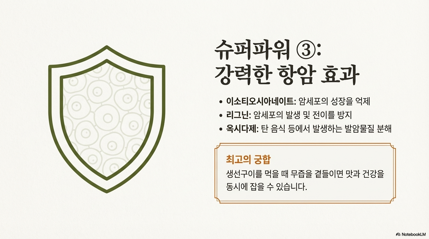 무의 이소티오시아네이트 성분이 암세포 성장을 억제해요. 특히 리그닌 성분은 암세포 발생과 전이를 막아주고, 옥시다제는 탄 생선 같은 발암물질을 분해하는 효능이 있어요.
