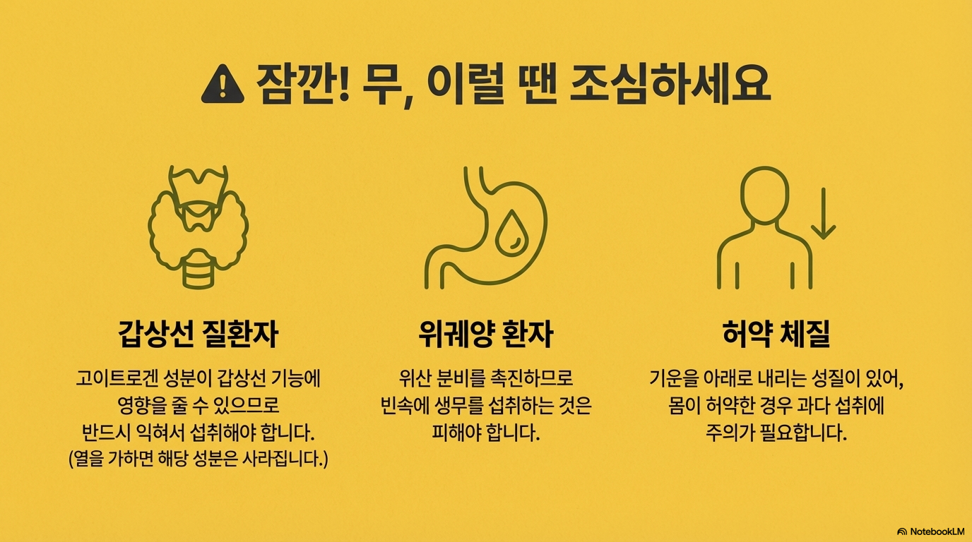 무의 고이트로겐 성분이 갑상선 기능 저하나 비대증을 유발할 수 있어요.