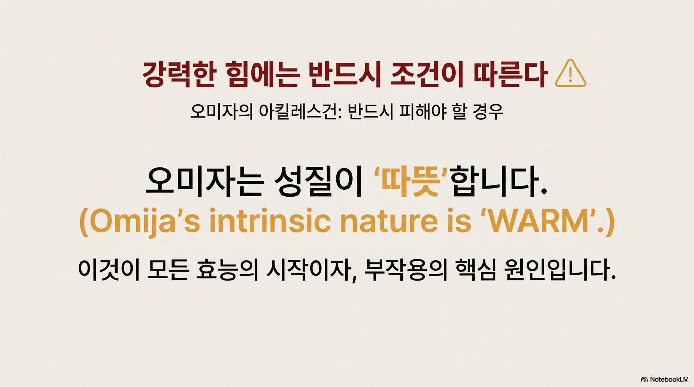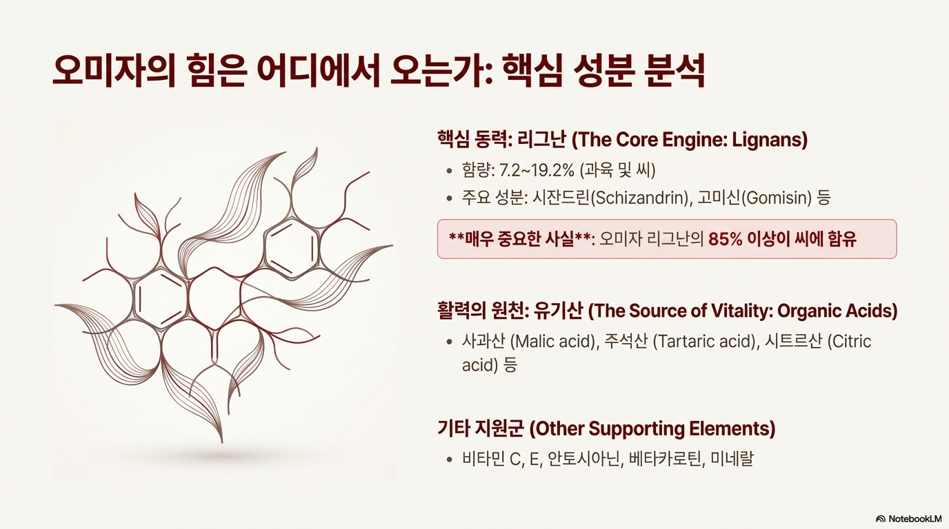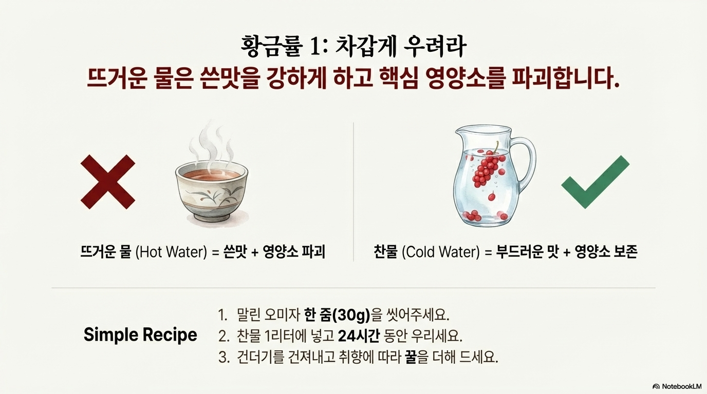 ✅ 과학적 관점: 리그난(시잔드린, 고미신) 성분의 간 보호, 항산화, 근육·뼈 건강 효과는 다수의 연구로 입증되었다. 하지만 오미자는 따뜻한 성질이므로 열이 많은 사람, 감기로 열이 날 때는 절대 금기다. 효과를 보려면 최소 3개월 이상 꾸준히 섭취해야 하며, 리그난의 85%가 씨에 있으므로 씨까지 섭취해야 한다. 뜨거운 물에 달이면 영양성분이 파괴되므로 냉수 우림이 필수다.