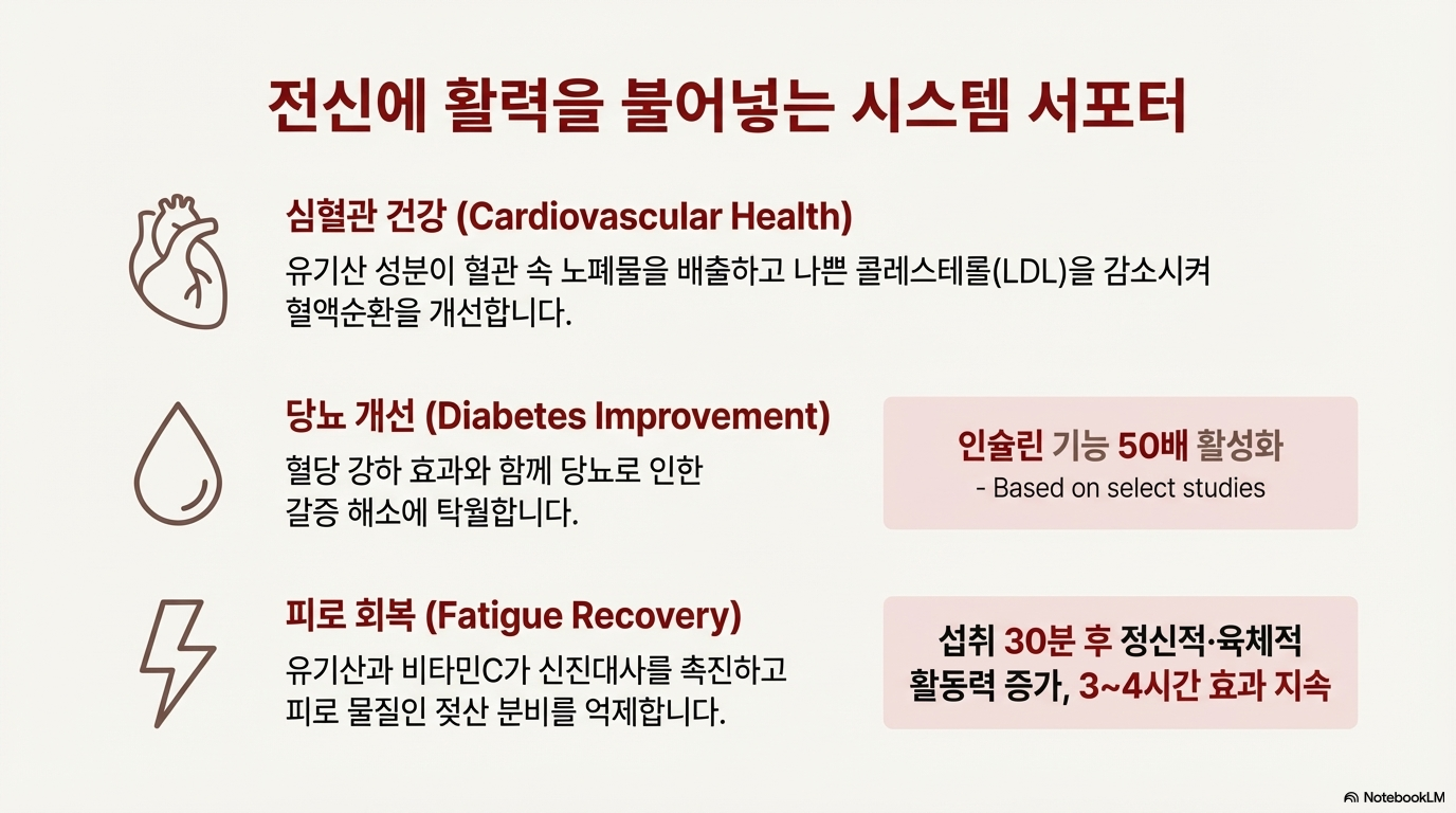 ✅ 유기산 성분 (사과산, 시트르산, 호박산 등)이 체내 신진대사와 혈액순환을 원활하게 해요.