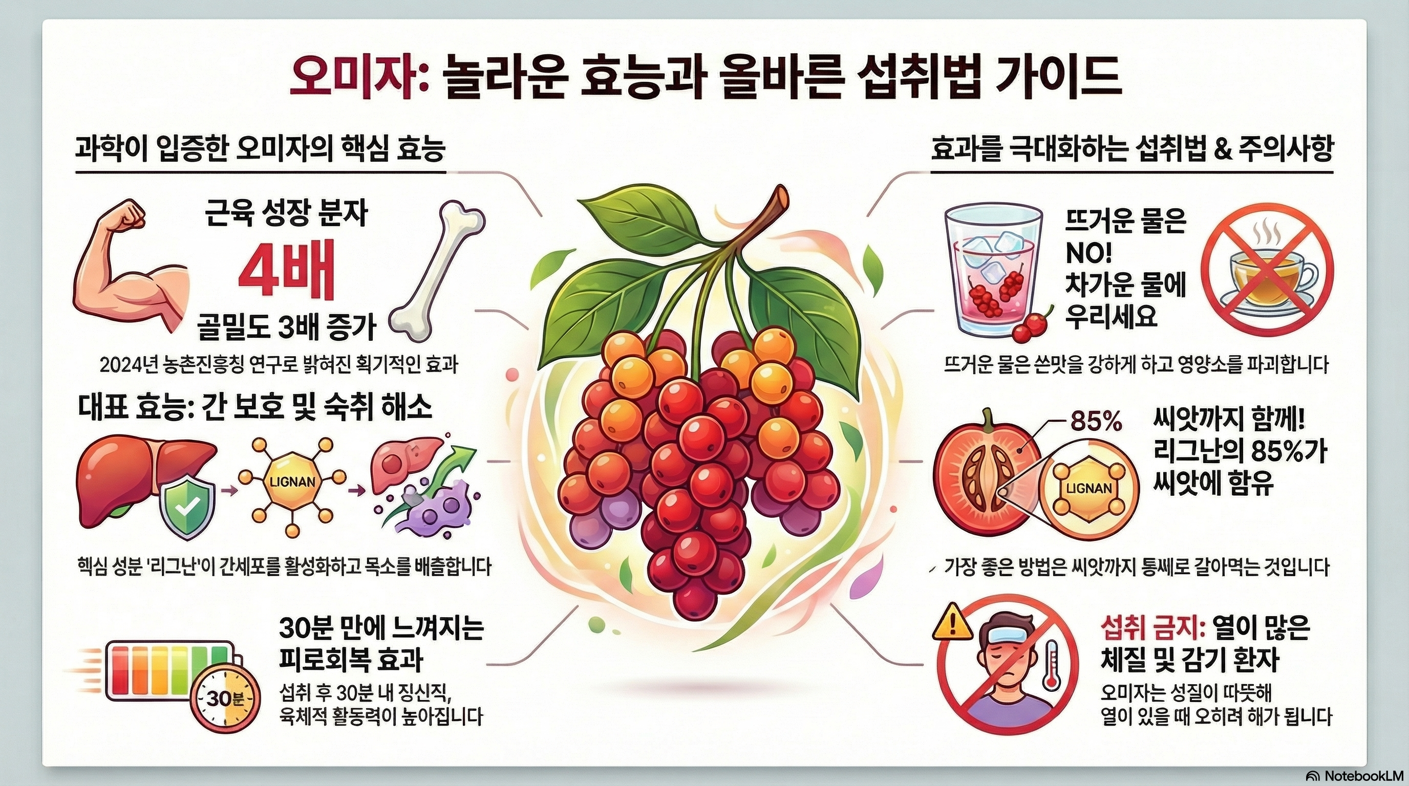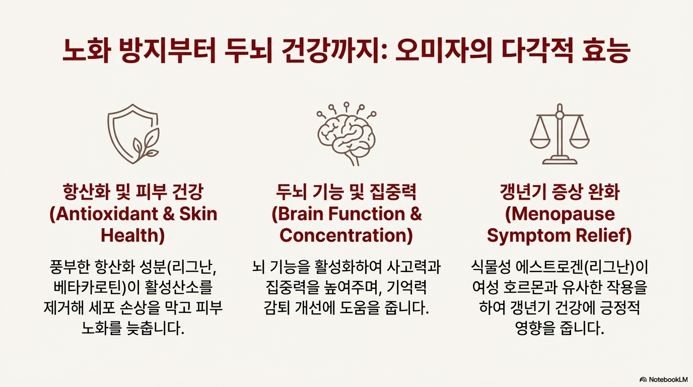 오미자는 "다섯 가지 맛의 신비", "만병통치약"이라 불릴 만큼 다양한 건강 효능을 가진 것은 사실이에요. 특히 간 건강, 폐·기관지 건강, 근육·뼈 건강, 당뇨 개선에 탁월한 효과가 과학적으로 입증됐죠.