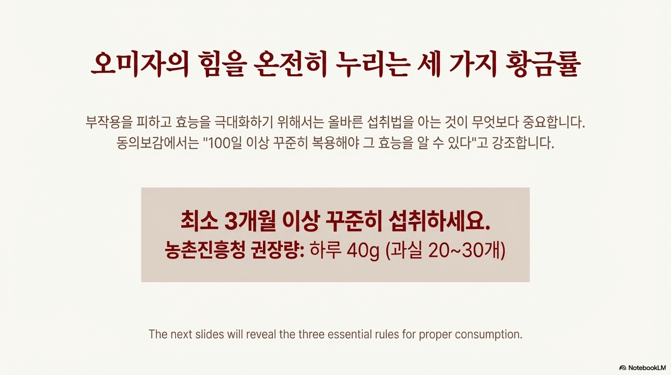 오미자는 만병통치약이 아니에요. 최소 3개월 이상 꾸준히 섭취하고, 씨까지 먹으며, 체질에 맞게 올바르게 섭취할 때 간 건강, 폐 건강, 근육·뼈 건강에 도움을 얻을 수 있는 전통 약재예요. 하지만 열이 많은 사람, 감기로 열이 나는 사람은 반드시 피해야 해요!