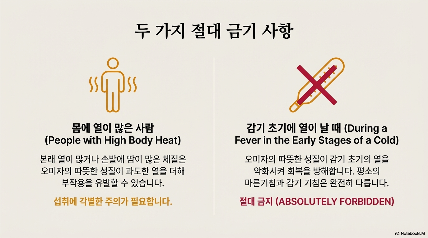 감기로 열이 날 때는 먹지 말아야 해요. 오미자는 따뜻한 성질이라 감기 초기 열이 있을 때는 오히려 역효과예요.
