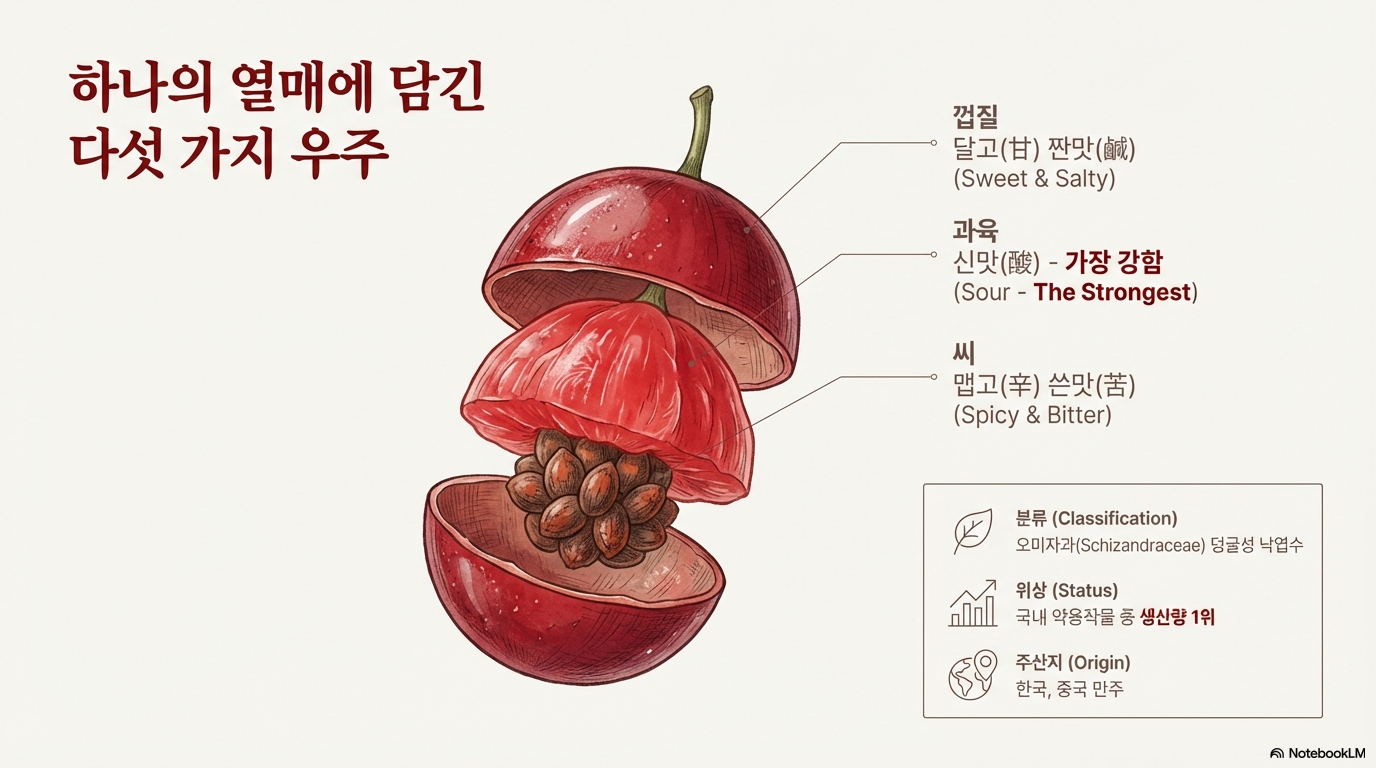 ✅ 참고: 신농본초경(최초 기록)에는 신맛만 기록되어 있어요. 현대인의 미각으로는 신맛이 압도적으로 강하게 느껴져요.