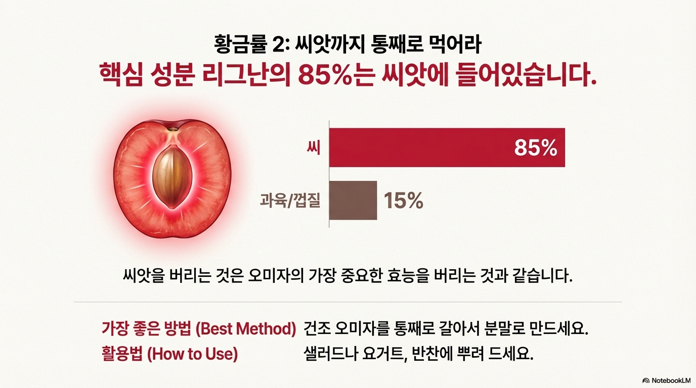 ✅ 매우 중요: 오미자 리그난의 85% 이상이 씨에 들어있어요!