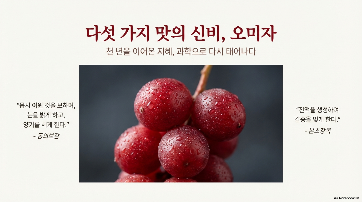 "다섯 가지 맛을 가진 신비로운 열매", "세상에서 구할 수 없는 영혼의 맛"이라 불리는 오미자. 신맛, 단맛, 쓴맛, 매운맛, 짠맛이 한 열매에 모두 들어있는 신비한 과일이에요. 오늘은 오미자의 진짜 효능과 반드시 알아야 할 부작용, 그리고 올바른 섭취 방법까지 정확하게 알려드릴게요.